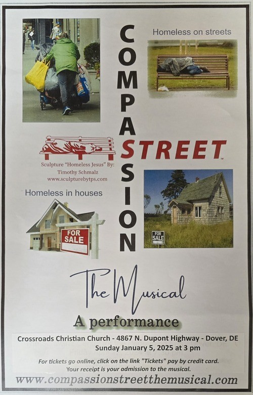 Inspired by his encounters with homeless individuals around the world, Rev. Paul Mast (an ordained Catholic priest) felt led to write a book detailing those experiences. "Street Sabbatical – Life Lessons for a Contemplative Beggar" was published in 2014. Fast forward 9 years and the book evolved into a musical. You have an opportunity to witness one of only two premiers right here in Delaware. Join us on Jan 5 at 3pm in our Chapel to witness the fruits of his labor.