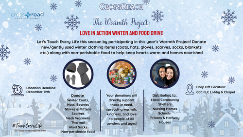 This winter, CrossReach is hosting The Warmth Project: Love in Action Winter & Food Drive to support individuals and families facing hardship during the colder months. We’re collecting new or gently used winter clothing items (coats, hats, gloves, scarves, socks, and blankets only) along with non-perishable food to help keep hearts warm and homes nourished. Everyone is welcome to participate, whether by donating items or spreading the word. Together, we can share God’s love in a meaningful way and make a difference right here in our local community.