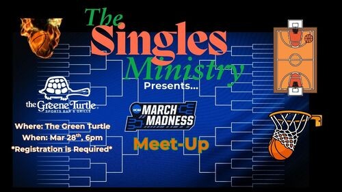 Singles Ministry March Madness Meet-Up! Join us for a fun, laid-back night of food, fellowship, and NCAA March Madness excitement! Whether you're a die-hard basketball fan or just here for the food and great conversation, this is your kind of tournament. Saturday, March 28, 2026 at 6:00 PM, The Green Turtle 391 N. DuPont Hwy, Dover, DE 19901.